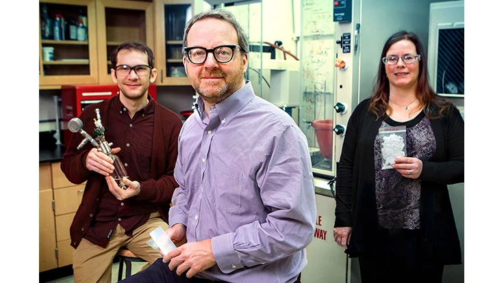 Pictured above: Geoffrey Coates, center, in his lab with James Eagan, a postdoctoral researcher in Coates’ group, and researcher Anne LaPointe. Credit: Cornell University