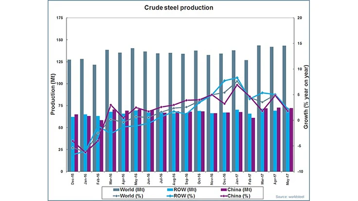 World crude steel production for the 67 countries reporting to the World Steel Association (Worldsteel) was 143.3 million metric tons in May 2017, a 2 percent increase compared with May 2016, according to the association.