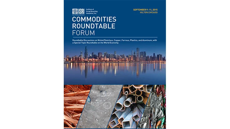The Institute of Scrap Recycling Industries (ISRI) is hosting its annual Commodities Roundtable Forum, Sept. 9 to 11, 2015, in Chicago. The event provides a comprehensive view of what is happening across a wide range of recycled commodities, including ferrous and nonferrous metals, recovered paper and plastics, and the key trends affecting the $106 billion scrap recycling industry, ISRI says.