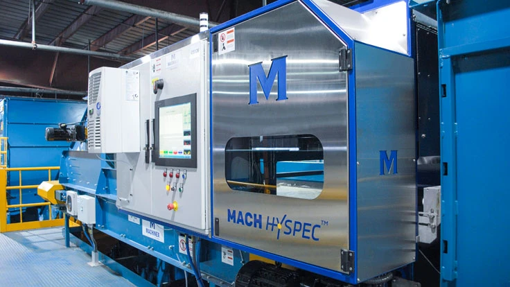 Two Mach Hyspec optical sorters will be installed; the first one is a dual-eject unit that will sort polyethylene terephthalate (PET) bottles and fiber with the same machine, while the second one is a dual-channel unit that will sort high-density polyethylene (HDPE) on the first channel and do an HDPE color sort on the second channel. Also included in the system are ferrous and nonferrous separators, a light fraction separator on glass, an aspiration system linked to a closed-door baler for plastic film and two trash compactors for system residue.