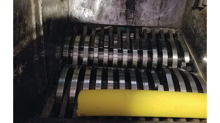 The company’s dual-shaft shredder produces material sized 2 inches by 12 inches (5 centimeters by 30 centimeters), making contamination that employees might have missed in preprocessing easier to detect than a smaller particle size might, Troy says. The shredder also can handle any metal that might have been overlooked. “It doesn’t chip or break a blade,” he says.