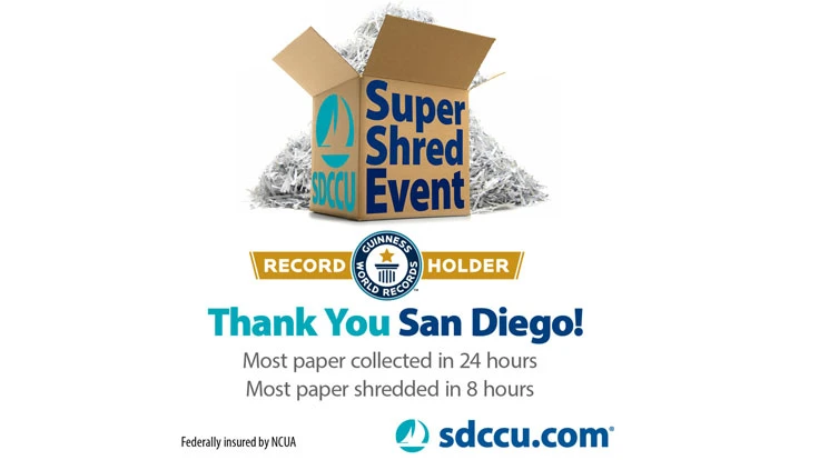 "We thank everyone who came out for this year's SDCCU Super Shred Event and helped once again put San Diego on the global map with two new world records. Most of all, SDCCU is happy to provide this free service to the community to help people protect their identity by providing an opportunity to properly dispose of confidential information," says SDCCU President and CEO Teresa Halleck. "This is especially important with the continued increase in the prevalence of fraud in recent years. The first rule in protecting against fraud is if you don't need it, shred it."