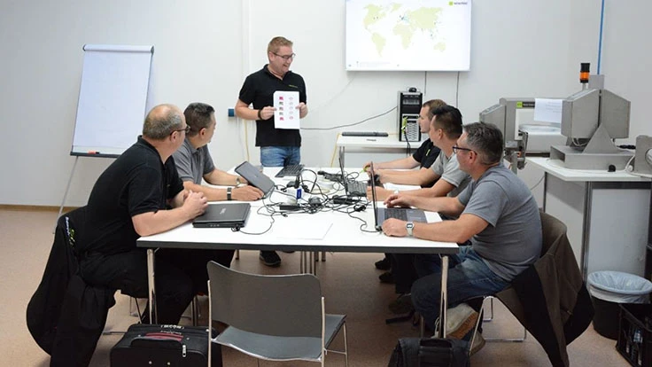 Martin Aschenbrenner (standing), head of Sesotec service engineer training, informs his colleagues from all over the world about innovations in sorting systems.