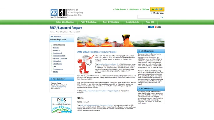 “The SREA Reasonable Care Compliance Program Reports are a quick and easy way for recyclers to protect themselves from costly liability,” says Robin Wiener, president of ISRI. “In the event a customer location is named as a Superfund site, it has the potential to put a recycler out of business. SREA reports are a low-cost, effective way of showing due diligence needed to avoid liability. It is a huge advantage for ISRI members.”
