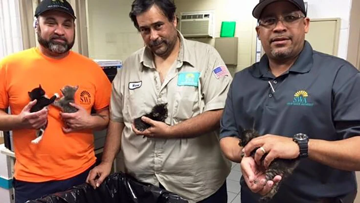 A litter of kittens was rescued from a garbage bag by Palm Beach County Solid Waste Authority workers April 8, 2016, a report from WPTV says. The kittens were four-to-five-weeks old.